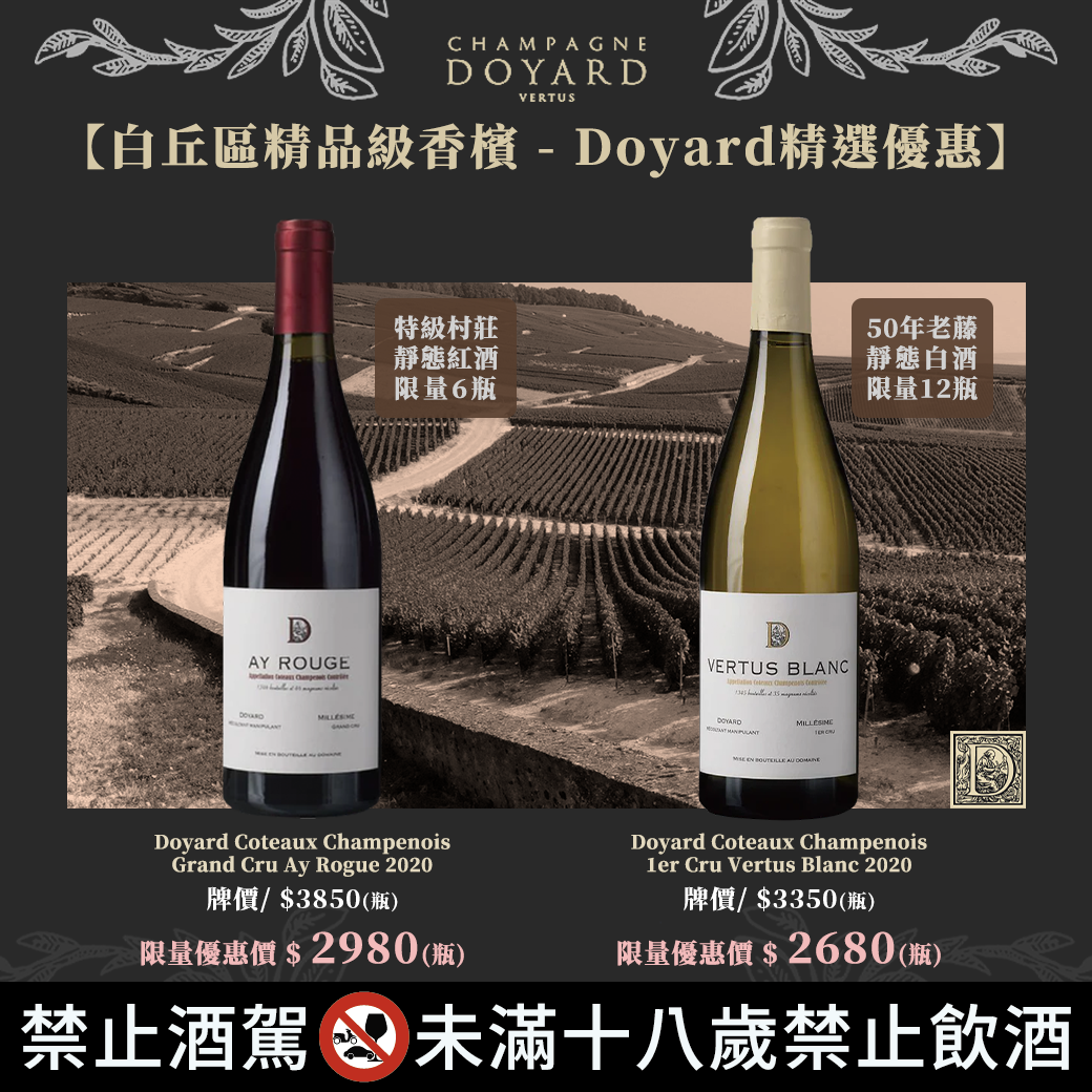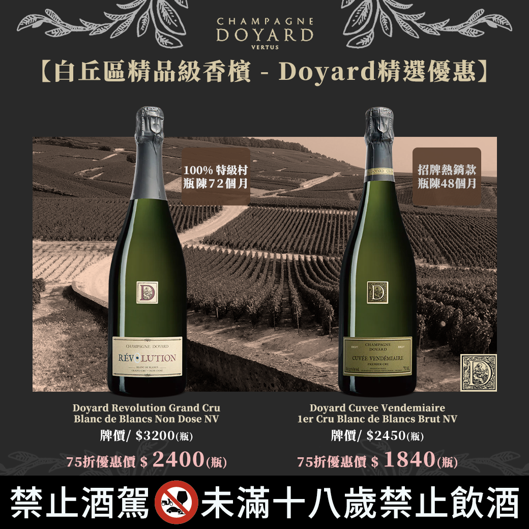 Doyard以平均40年以上的老藤、嚴格的有機農法與低產量管理,確保葡萄品質的純粹。每年超過一半的葡萄與基酒供應給世界頂尖香檳大廠,使得自家酒款產量極為稀少,頂級酒款年產量甚至僅有1,000–1,200 瓶。釀造上全程手工,僅取第一道榨汁,極少乳酸發酵並維持低添糖風格,成就沉穩洗鍊的酒體,酸度細膩且氣泡優雅,兼具小農風土特色與大廠穩定品質。