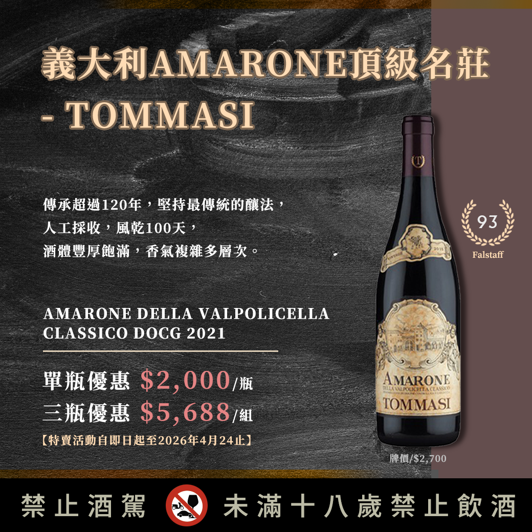 於1902 年成立至今,歷經家族四代成員的細心經營,已經在Veneto 當地耕耘百年的 Tommasi 酒莊,將 Amarone 的古典與浪漫,經由職人的釀造工藝,展現出屬於義大利葡萄酒的華麗滋味,『可謂是當地傳統之最』。
